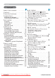 Content Content About this manual . . . . . . . . . . 1 Content . . . . . . . . . . . . . . . . . . 2 Projector features . . . . . . . . . . 3 Preparations . . . . . . . . . . . . . . 3 Contents of package . . . . . . . . . . . . .3 Fastening the lens cover . . . . . . . . . .3 Part names . . . . . . . . . . . . . . . 4 Projector . . . . . . . . . . . . . . . . . . . . . .4 Control panel . . . . . . . . . . . . . . . . . . .5 Rear panel . . . . . . . . . . . . . . . . . . . . .5 Remote control . . . . . .