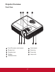 Projector Overview Front View 9 1 8 2 7 6 3 4 5 1 Front IR remote control sensor 6 2 Elevator foot 7 Zoom ring 3 Projection lens 8 Focus ring 4 Speaker 9 Lamp cover 5 Ventilation holes 7 Control panel