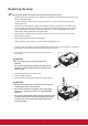 Replacing the lamp Turn the power off and disconnect the projector from the power outlet. • To reduce the risk of electrical shock, always turn the projector off and disconnect the power cord before changing the lamp. • To reduce the risk of severe burns, allow the projector to cool for at least 45 minutes before replacing the lamp. • o reduce the risk of injuries to fingers and damage to internal components, use caution when T removing lamp glass that has shattered into sharp pieces.