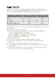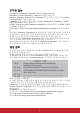 메뉴 작동하기 메뉴 구조 선택한 신호 유형에 따라 OSD 메뉴가 다릅니다 . 프로젝터에 감지된 신호가 하나 이상이어야 관련 메뉴 항목들이 표시됩니다 . 프로젝 터에 연결된 장치가 없거나 감지된 신호가 없으면 , 표시되는 메뉴 항목들도 많지 않 습니다 . 기본 메뉴 하위 메뉴 옵션 화면 색상 꺼짐 / 백색 판 / 블랙보드 / 녹색 판 화면비 자동 /4:3/16:9 (PS600X/PS501X/PS500X)/ 16:10 (PS600W/PS501W)/ 파노라마 (PS600W/PS501W)/2.35:1/ 왜상 (PS600W/PS501W) 키스톤 보정 수직 / 수평 (PS600W/PS600X) 1. 모서리 조정 (PS600W/PS600X) 디스플레이 위치 페이지 수평 크기 줌 오버스캔 꺼짐 /1/2/3/4/5 3X Fast Input 비활성 / 활성 색상 모드 가장 밝게 / 프리젠테이션 / 보통 / 사진 / 영화 밝기 명암비 색온도 2.