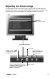 Do the following to adjust the screen image: 1 To display the Main Menu, press button [1]. Main Menu AUTO SET Auto Adjust Contrast/Brightness Color Adjust i Information Image Adjust ? Setup Menu Memory Recall 1:EXIT 2:SELECT NOTE: All OnView menus and adjustment screens disappear automatically after about 15 seconds. This time period is adjustable through the Setup menu and the OSD timeout control described on page 11.