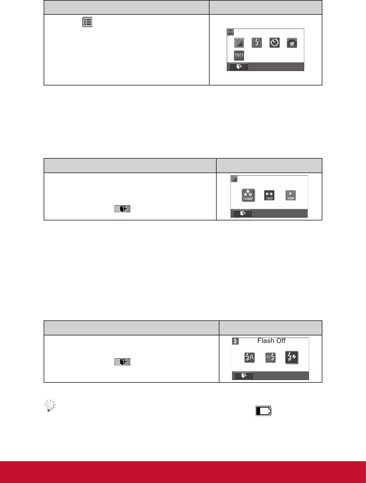 • Flash Off: The ash will not re under any circumstances. Use this mode when taking photo in a