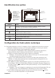 Identification des parties Boutons de contrôle Port USB pour unités Flash USB Emplacement Secure Digital et Multi Media Card Interrupteur d'alimentation TM TM Emplacement xD Picture Card TM Emplacement Memory Stick , Memory Stick Pro , Memory Stick Duo et Memory Stick Pro Duo TM TM TM TM Support réglable Entrée alimentation secteur Bouton Action Déplacer la sélection vers le haut ou la gauche, afficher la photo précédente, ou sélectionner le fichier précédent l'option mise en surbrillance, lan