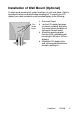 Installation of Wall Mount (Optional) To obtain a wall-mounting kit, contact ViewSonic or your local dealer. Refer to the instructions that come with the base mounting kit. To convert your LCD display from a desk-mounted to a wall-mounted display, do the following: Four screw holes 1 2 3 4 Disconnect Power. Lay the LCD display face down on a towel or blanket. Notice the four screw holes on the bottom of the base for the wall mount.