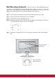 Wall Mounting (Optional) For use only with UL Listed Wall Mount Bracket To obtain a wall-mounting kit or height adjustment base, contact ViewSonic® or your local dealer. Refer to the instructions that come with the base mounting kit. To convert your LCD display from a desk-mounted to a wall-mounted display, do the following: Step 1. Verify that the power button is turned Off, then disconnect the power cord. Step 2. Lay the LCD display face down on a towel or blanket. Step 3.