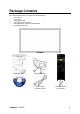 Package Contents Your new CD4220 monitor box* should contain the following: y LCD monitor y Power Cord y Video Signal Cable y User’s Manual in CD Wizard y Wireless Remote Control and AAA Batteries y Quick Start Guide (A4) LCD monitor Quick Start Guide Video Signal Cable CD Wizard Power cored For North America ViewSonic CD4220 Remote control & AAA batteries 6