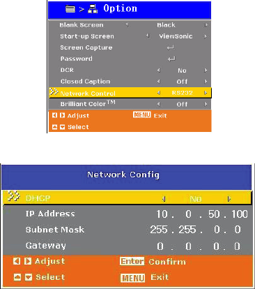 För nätverksstyrning kan du välja mellan RS232 och LAN. Om du väljer RS232 går det