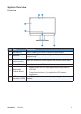 System Overview Front view No. Item Description 1 Microphone Use for chatting and other interactive applications. 2 Webcam Use for taking pictures, recording videos, and video conferencing. 3 Touch Screen (select model) Touch the screen to select objects and perform other tasks. 4 Power Button Press to power on / off the device. 5 Brightness Control Button 6 LED The LED turns blue when the corresponding function is (wireless / HDD) enabled ViewSonic VPC220 1.