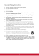 Important Safety Instructions 1. Read these instructions completely before using the equipment. 2. Keep these instructions in a safe place. 3. Heed all warnings. 4. Follow all instructions. 5. Do not use this equipment near water. Warning: To reduce the risk of fire or electric shock, do not expose this apparatus to rain or moisture. 6. Clean with a soft, dry cloth. If further cleaning is required, see “Cleaning the Display” in this guide for further instructions. 7.