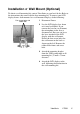 Installation of Wall Mount (Optional) To obtain a wall-mounting kit, contact ViewSonic or your local dealer. Refer to the instructions that come with the base mounting kit. To convert your LCD display from a desk-mounted to a wall-mounted display, do the following: Four screw holes with rubber filler 1 Disconnect Power. 2 Lay the LCD display face down on a towel or blanket. If you remove the base for a wall mount, the microphone in the base is disconnected.