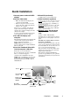 Quick Installation 1 Connect power cord and AC/DC adapter 2 Connect video cable • Make sure both the LCD display and computer are turned OFF • Remove rear panel covers if necessary • Connect the video cable from the LCD display to the computer Macintosh users: Models older than G3 require a Macintosh adapter. Attach the adapter to the computer and plug the video cable into the adapter. To order a ViewSonic® Macintosh adapter, contact ViewSonic Customer Support.