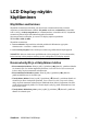 LCD Display-näytön puhdistus • VARMISTA, ETTÄ LCD DISPLAY-NÄYTTÖ ON KYTKETTY POIS PÄÄLTÄ. • ÄLÄ KOSKAAN SUIHKUTA TAI KAADA NESTETTÄ SUORAAN KUVARUUDULLE TAI KOTELOON. Näytön puhdistus: 1. Pyyhi kuvaruutu puhtaalla, pehmeällä, nukattomalla liinalla. Liina poistaa pölyn ja muut hiukkaset. 2. Jos kuvaruutu ei puhdistu, laita pieni määrä ei-ammoniakkipitoista, alkoholitonta lasinpuhdistusainetta puhtaaseen, pehmeään, nukattomaan liinaan ja pyyhi kuvaruutu. Kotelon puhdistus: 1. Käytä pehmeää, kuivaa liinaa. 2.
