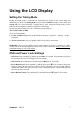 Cleaning the LCD Display • MAKE SURE THE LCD DISPLAY IS TURNED OFF. • NEVER SPRAY OR POUR ANY LIQUID DIRECTLY ONTO THE SCREEN OR CASE. To clean the screen: 1. Wipe the screen with a clean, soft, lint-free cloth. This removes dust and other particles. 2. If further cleaning is required, apply a small amount of non-ammonia, non-alcohol based glass cleaner onto a clean, soft, lint-free cloth, and wipe the screen. To clean the case: 1. Use a soft, dry cloth. 2.