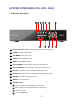 SYSTEM CONFIGURE (4CH, 8CH, 16CH) 1. Front panel description. 1 2 3 4 8 5 9 6 10 7 12 1 Remote Controller Sensor : Communicate with the remote controller. 2 POWER : System Power On/Off 3 SCR MODE : Select split screen. 4 SEARCH : Enter playback mode. 5 MENU : Setup DVR all setting. 6 FAST REWIND : In Search mode, control fast rewind speed. 7 FAST FORWARD : In Search mode, control fast forward speed. 8 USB Port : For Mouse control and extra USB backup device.