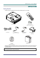 D DLLPP PPrroojjeeccttoorr –– U Usseerr’’ss M Maannuuaall GETTING STARTED Packing Checklist Carefully unpack the projector and check that the following items are included: REMOTE CONTROL (WITH TWO AAA BATTERIES) DLP PROJECTOR POWER CORD COMPUTER CABLE (VGA-VGA) USB CABLE (USB TYPE A-TO-B USB) RGB TO COMPONENT ADAPTER (OPTIONAL) CARRYING CASE CD-ROM (THIS USER’S MANUAL) Contact your dealer immediately if any items are missing, appear damaged, or if the unit does not work.