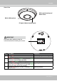 VIVOTEK Outer View IP66-rated Vandal-proof Dome Cover Built-in Microphone IR lights hidden beneath panel IMPORTANT: Record the MAC address under the camera base before installing the camera. Item 1 2 3 4 083236 LED Status Description Steady Red Power on and system booting Red LED off Powered off Steady Red + blinking Green every 1 sec. (Green Network heartbeat LED on for 1 sec and off for another) Steady Red + Green LED off Network disconnected Blinking Red every 0.15 sec.