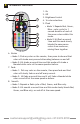 4 IR Remote Functions 1. 2. 3. 4. 5. 3 2 OFF 1 ON G R 4 B W FLASH 5 STROBE 6 FADE 7 SMOOTH 8 On Off Brightness Control 16 color selections Flash • Mode 1: Repeats Red, Green, Blue + color cycle for 1 second duration of each of the seven colors within this mode. • Mode 2: Hit flash a second time and this mode slowly blends the same seven colors from mode one, mixing them together. 6.