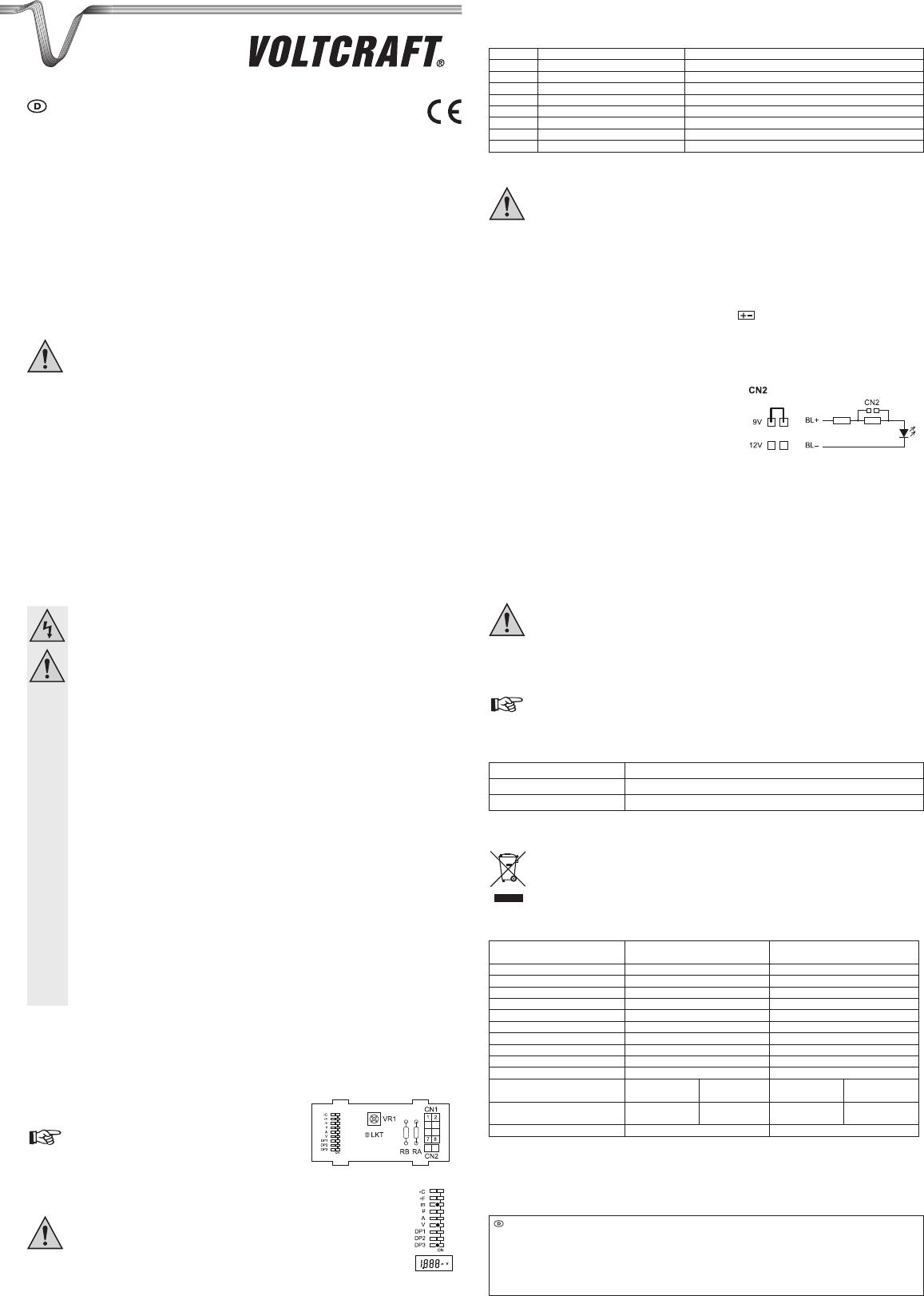 Die Anzeigenbeleuchtung kann durch Anlegen einer Spannung von wahlweise 9 V/DC oder 12 V/DC eingeschaltet werden.