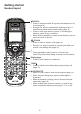Getting started Handset layout /VOL+ • Press to review the directory when the telephone is not in use (page 20). • During a call, press to increase the listening volume. A double beep sounds at the highest setting (page 14). • Press to scroll up while in a menu, or reviewing the directory, caller ID log or redial list. • When entering numbers or names in the directory, press to move the cursor to the right. MENU/SELECT • Press to show the menu (page 9).