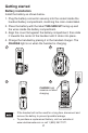 Getting started Battery installation Install the battery as shown below. 1. Plug the battery connector securely into the socket inside the handset battery compartment, matching the color-coded label. 2. Place the battery with the label THIS SIDE UP facing up and the wires inside the battery compartment. 3. Align the cover flat against the battery compartment, then slide it towards the center of the handset until it clicks into place. 4. Charge the handset by placing it in the handset charger.