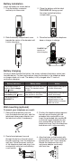 Battery installation Install the battery as shown below. . Plug the battery connector securely into the socket. 2. Place the battery with the label THIS SIDE UP facing up and the wires inside the battery compartment. 3. Slide the battery compartment cover towards the center of the handset until it clicks into place. 4. Place the handset in the telephone base or charger to charge. CHARGE light remains on when charging.