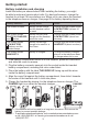 Getting started Battery installation and charging Install the battery as shown below. After installing the battery, you might be able to make and receive short calls. For best performance, charge the handset for at least 16 hours before use. When not in use, place the handset in the telephone base or charger. See page 29 for battery operating times. Battery indicators Battery status Action The screen is blank. Battery has no charge and the handset cannot be used.