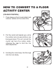 HOW TO CONVERT TO A FLOOR ACTIVITY CENTER (FOLDED POSITION): 1. Press down on the 2 round safety lock release buttons at the same time. 2. Pull the metal rod towards you, while the safety lock release buttons are being pressed. This will unlock the metal rod from the safety locks, allowing the legs to fold into the desired position. 3. Holding the main body, fold the legs into the main body.