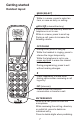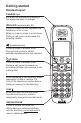 Getting started Handset layout MENU/SELECT Press to show the menu. While in a menu, press to select an item, or save an entry or setting. VOL/ (volume/directory) Press to enter the directory when the telephone is not in use. While in a menu, press to scroll up. During a call, press to increase the listening volume. OFF/CLEAR During a call, press to hang up. While the handset is ringing, press to silence the ringer temporarily.