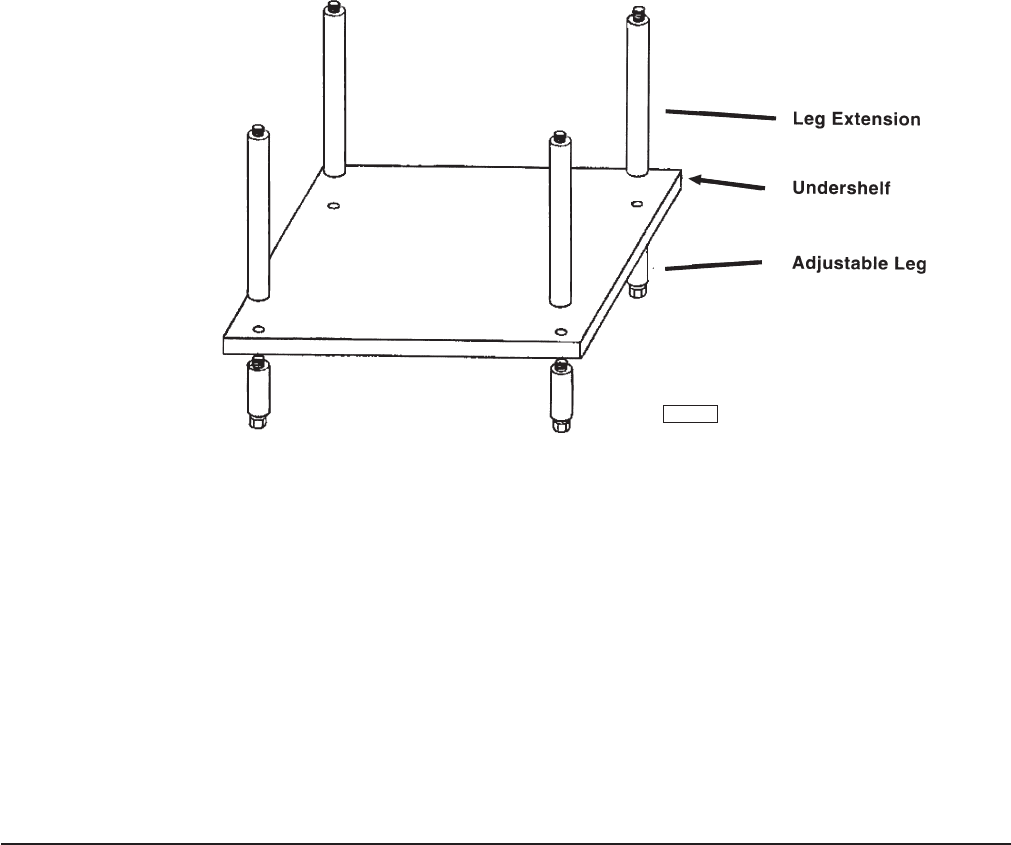 3. Start threaded end of adjustable leg through undershelf into internal threaded end of leg extension.