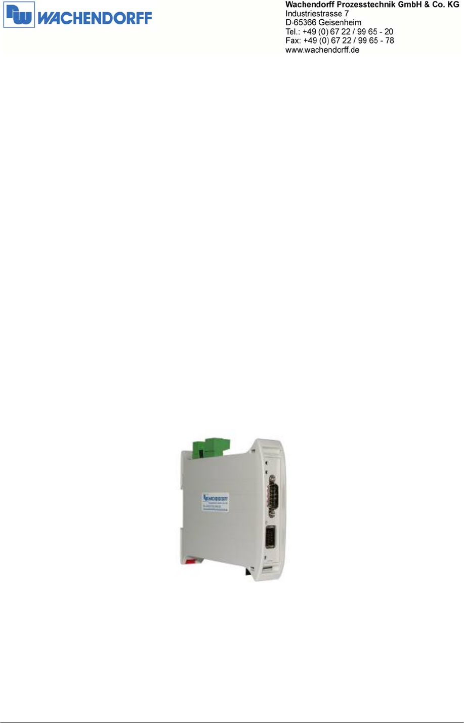 Betriebsanleitung Gateway Ethernet nach RS232/485 HD67038 © Copyright by Wachendorff Prozesstechnik GmbH & Co. KG, Industriestraße 7, D-65366 Geisenheim, Tel.: 06722/9965-20, Fax.: -78 Angaben ohne Gewähr Irrtümer und Änderungen vorbehalten.