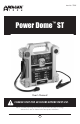 User’s Manual—Read before using this equipment TROUBLESHOOTING Problem Cause Solution Air compressor shut-off. High temperature protection. Allow the Power Dome cool for about 10 minutes. Lack of power output. Power Dome battery voltage is below 10 volts. Recharge the Power Dome immediately. Excessive current drawn by appliance being operated. Reduce load to maximum wattage. Fuse blown. Check and replace if necessary. Be sure replacement fuse is the same type and rating. Loud buzzing sound.
