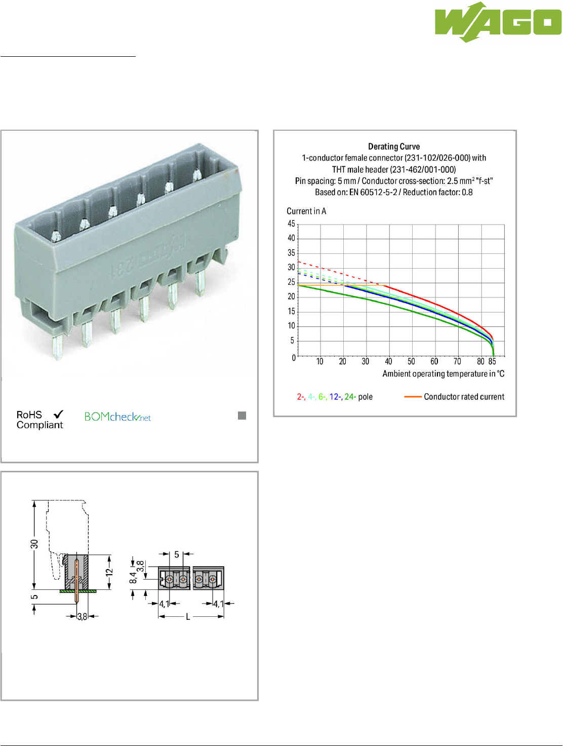 Data sheet | Item number: 231-139/001-000 www.wago.com/231-139/001-000 Item description Horizontal or vertical PCB mounting via straight or angled solder pins Pin cross-section: 1 x 1 mm With coding fingers Safety information 1: The MULTI CONNECTION SYSTEM (MCS) is designed without breaking capacity for compliance with DIN EN 61984. When used as intended, MCS Connectors shall not be connected/disconnected when live or under load.