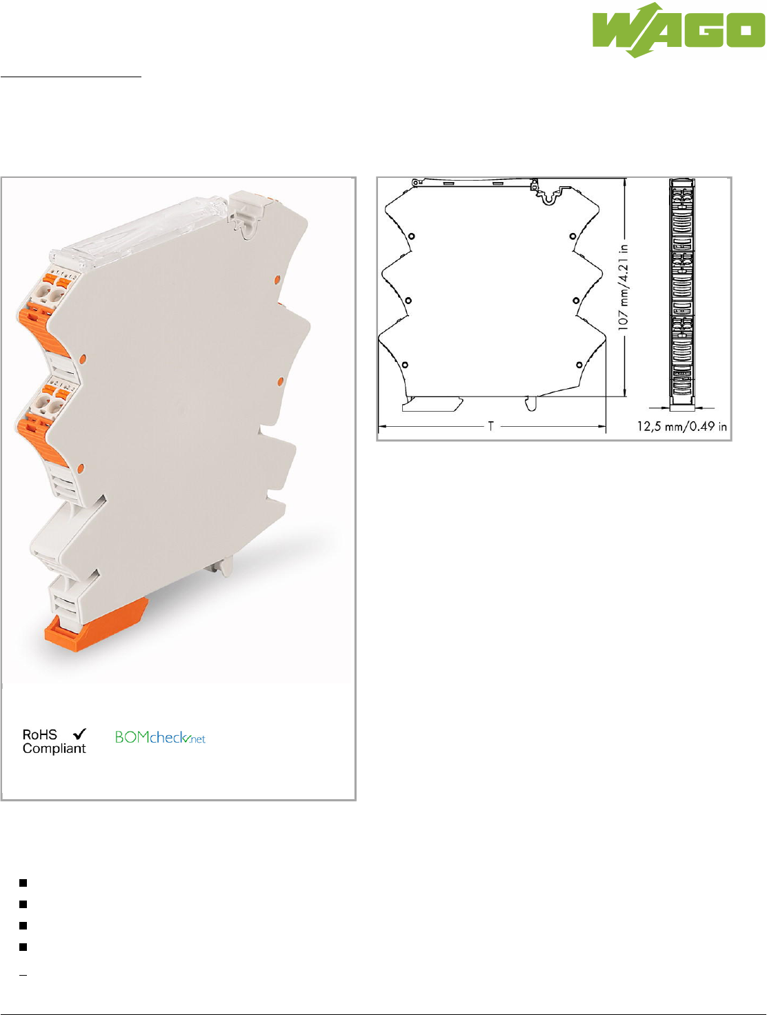 Datenblatt | Artikelnummer: 2857-101 www.wago.com/2857-101 Geometrische Daten Breite 12,5 mm / 0.492 inch Höhe 107 mm / 4.213 inch Tiefe 108 mm / 4.252 inch Rastermaß 5 mm (0.197 inch) Mechanische Daten Gehäusebauform Modulares Gehäuse Montageart Tragschiene 35 Werkstoffdaten Brennbarkeitsklasse gemäß UL 94 V0 Gehäusewerkstoff PC Klemmfederwerkstoff Chrom-Nickel-Federstahl (CrNi) Kontaktwerkstoff Elektrolytkupfer (Ecu) Brandlast 1.616 MJ Gewicht 59.