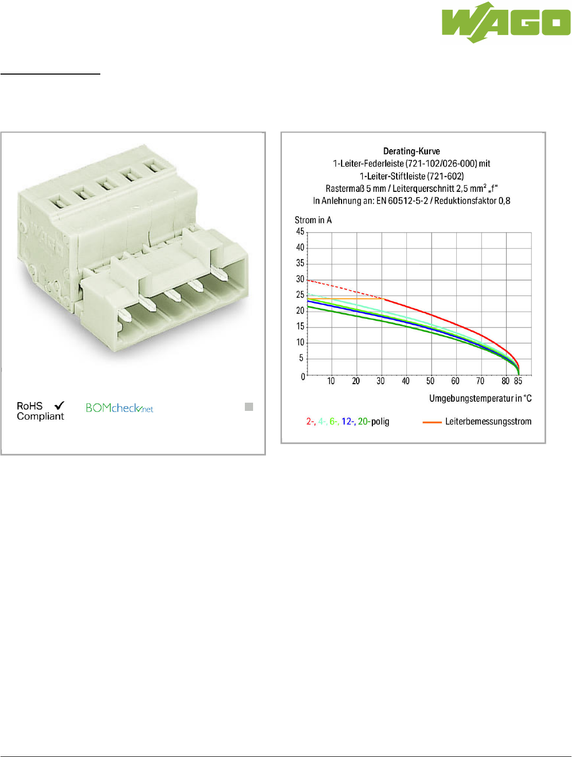 Data sheet | Item number: 721-603 www.wago.com/721-603 Connector connection type for conductors Mismating protection Yes Material Data Color light gray Material group I Insulating material Polyamide 66 (PA 66) Flammability class per UL94 V0 Clamping spring material Chrome nickel spring steel (CrNi) Contact material Electrolytic copper (Ecu) Contact plating tin-plated Fire load 0.091 MJ Weight 4.