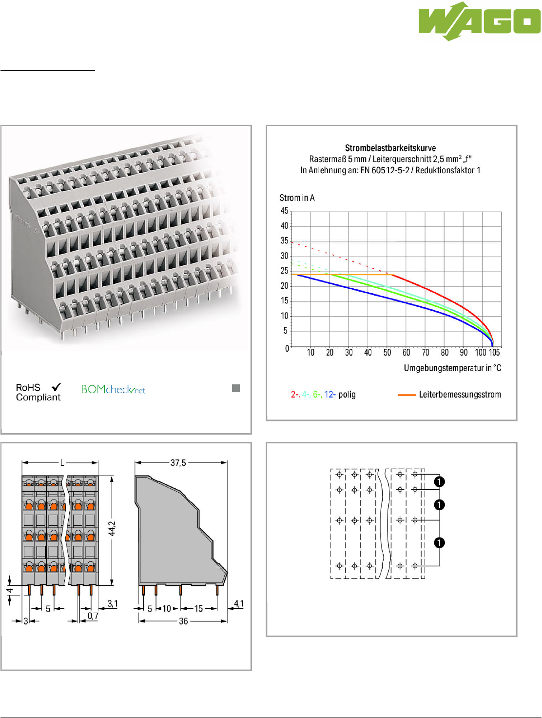 Data sheet | Item number: 738-106 Quadruple-deck PCB terminal block; 2.5 mm²; Pin spacing 5 mm; 4 x 6-pole; CAGE CLAMP® www.wago.com/738-106 Color: (1) Solder pins in a row L = (pole no. x pin spacing) + 1 mm Item description 06.12.