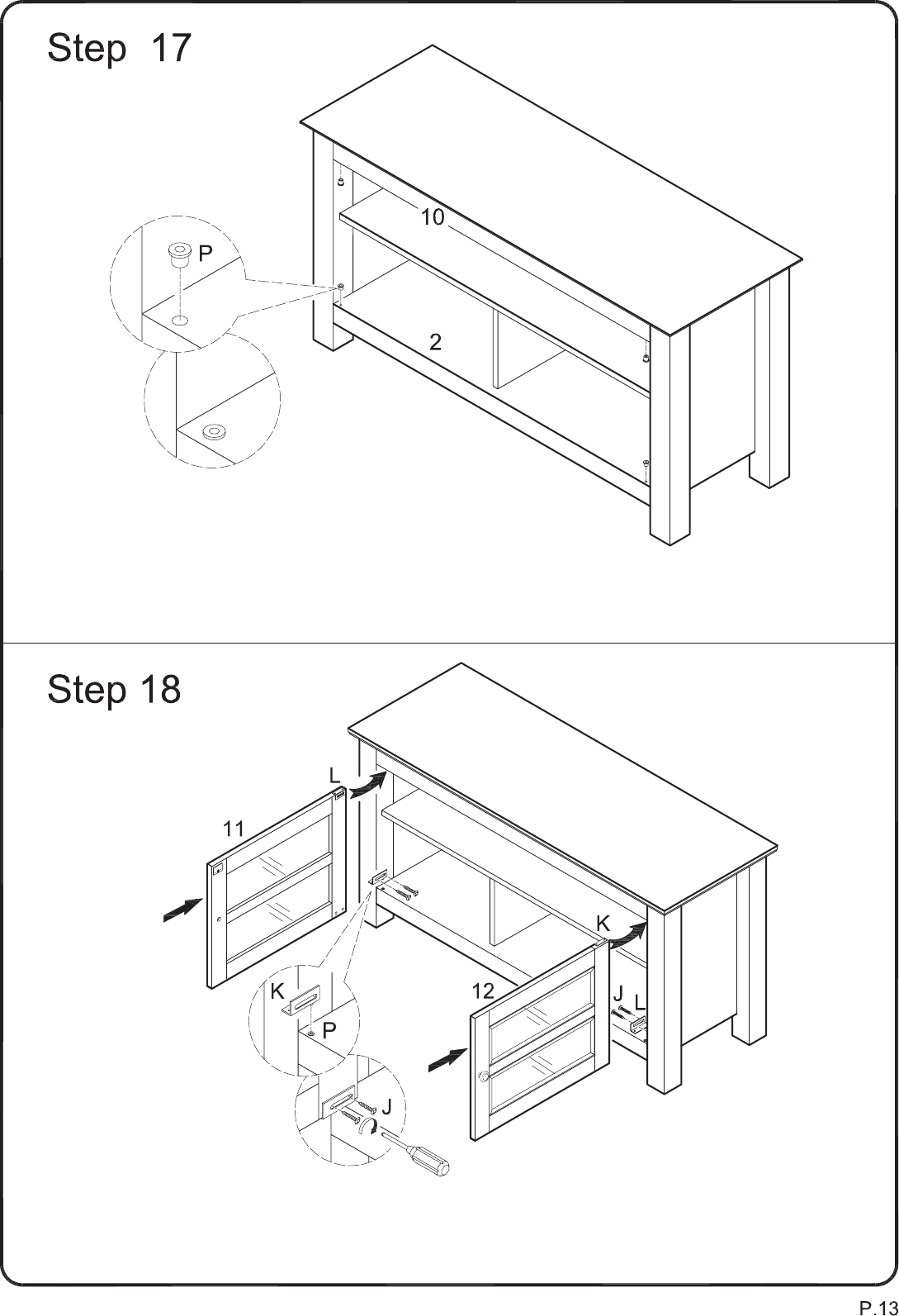 (11) using screws (J). Insert door hinge (L) into right bottom plastic pivot (P). Slide door (12) into place. Attach