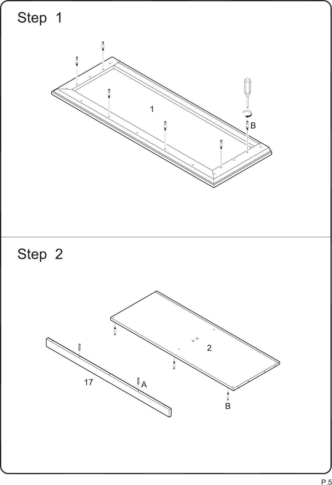 Screw cam bolts (B) into panel (2). Insert dowels (A) into slat (17).