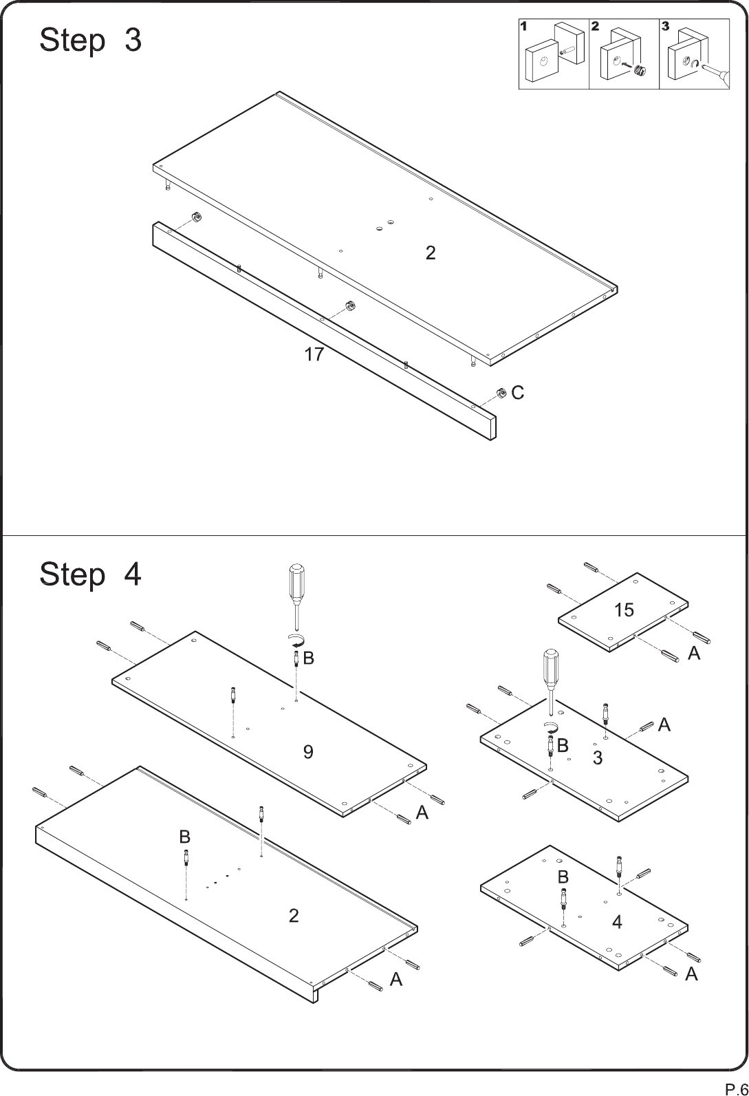 Insert dowels (A) into panels (2,3,4,15) and shelf (9). Screw cam bolts (B) into panels (2,3,4) and shelf (9).