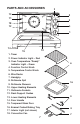 PARTS and accessories 10 2 3 11 5 18 12 4 1 14 13 15 1. Timer 2. Power Indicator Light – Red 3. Oven Temperature “Ready” Indicator Light – Green 4. Function Control Knob 5. Temperature Control Knob 6. Wire Racks 7. Handgrip 8. Rotisserie Spit 9. Rotisserie Skewers 10. Upper Heating Elements 11. Rotisserie Sockets 12. Rack Support Guides 13. Lower Heating Elements 14. Door Handle 15. Tempered Glass Door 16. Enamel Coated Baking Tray 17. Interior Light (not shown) 18.