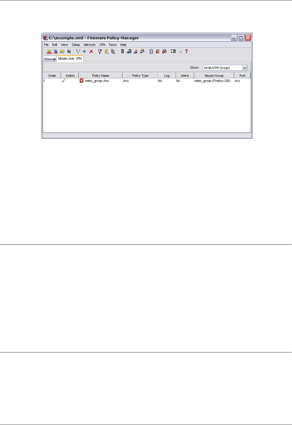 The Any policy is added to all Mobile VPN user groups by default. The Any policy allows traffic on all