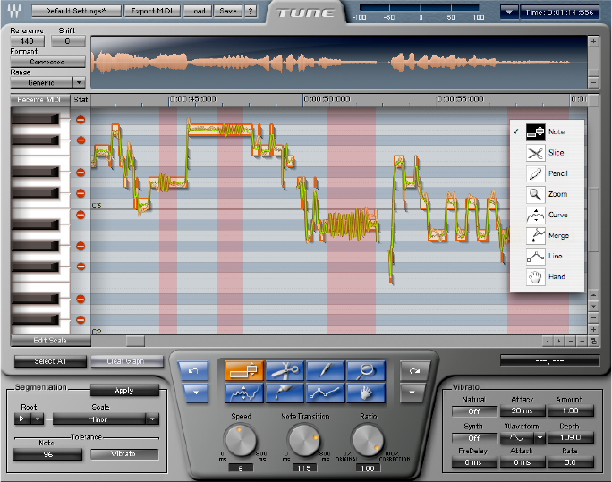 natural vibrato manipulation after you turned the segmentation on and natural vibrato was detected, in other words only the segmentation button will perform Natural vibrato detection and only on detected section you will be able to use the manipulation parameters. CORRECTION PARAMETERS SECTION: This section is located in the bottom center of the plug-in under the Graphic Tools section. In this section, Tune offers the three most important correction parameters: speed, note transition and ratio.