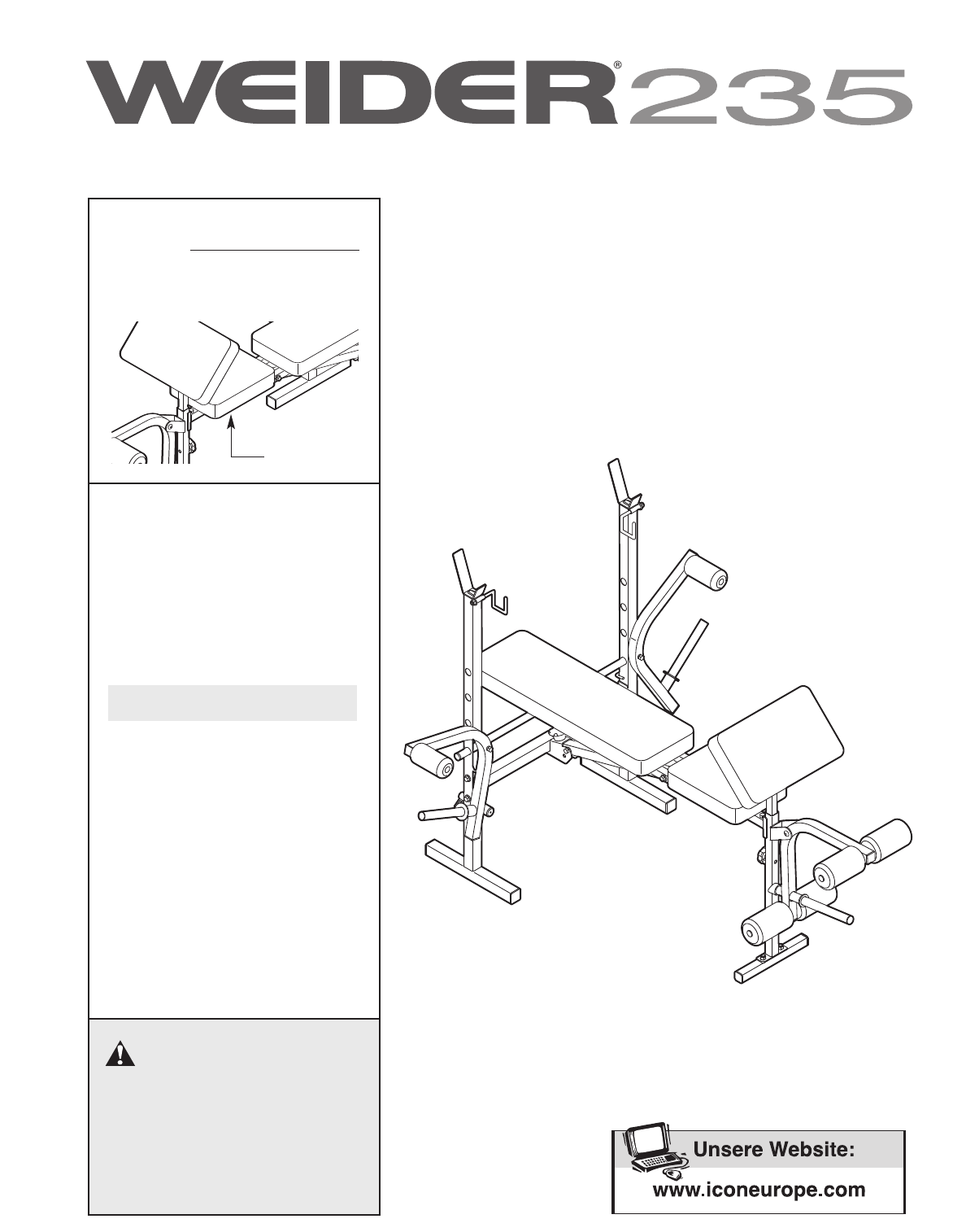 BEVOR SIE ANFANGEN Zunächst recht herzlichen Dank, dass Sie sich für die WEIDER® 235 Hantelbank entschieden haben. Die vielfältige Hantelbank WEIDER® 235 ist so konzipiert, dass Sie sie mit Ihren eigenen Hanteln (nicht beinhaltet) benutzen können, um jede Hauptmuskelgruppe in Ihrem Körper zu entwickeln.
