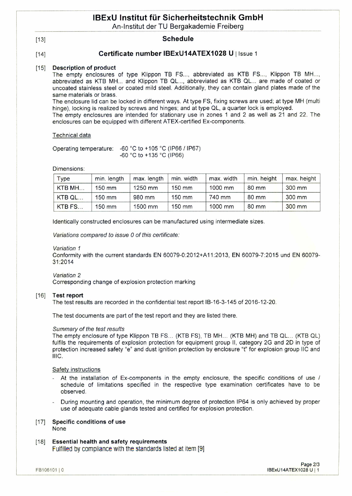 Certificate number IBExU14ATEX1028 U