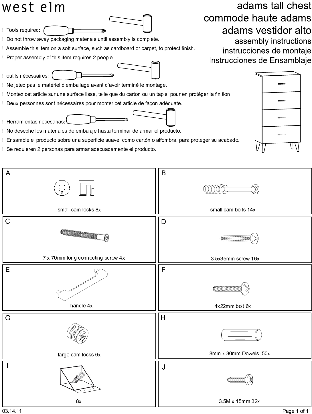 11. Insert drawers bottom first. Align with drawer guides on side panels. 11. Insérez les tiroirs inférieurs en premier. Alignezles avec les glissières situées sur les côtés. 11. Inserte las gavetas inferiores primero. Enfile con las guías en los paneles laterales. CARE INSTRUCTIONS Hardware may loosen overtime. Periodically check that all connections are tight. Wipe with a soft, dry cloth. To protect finish, avoid the use of chemicals and household cleaners.