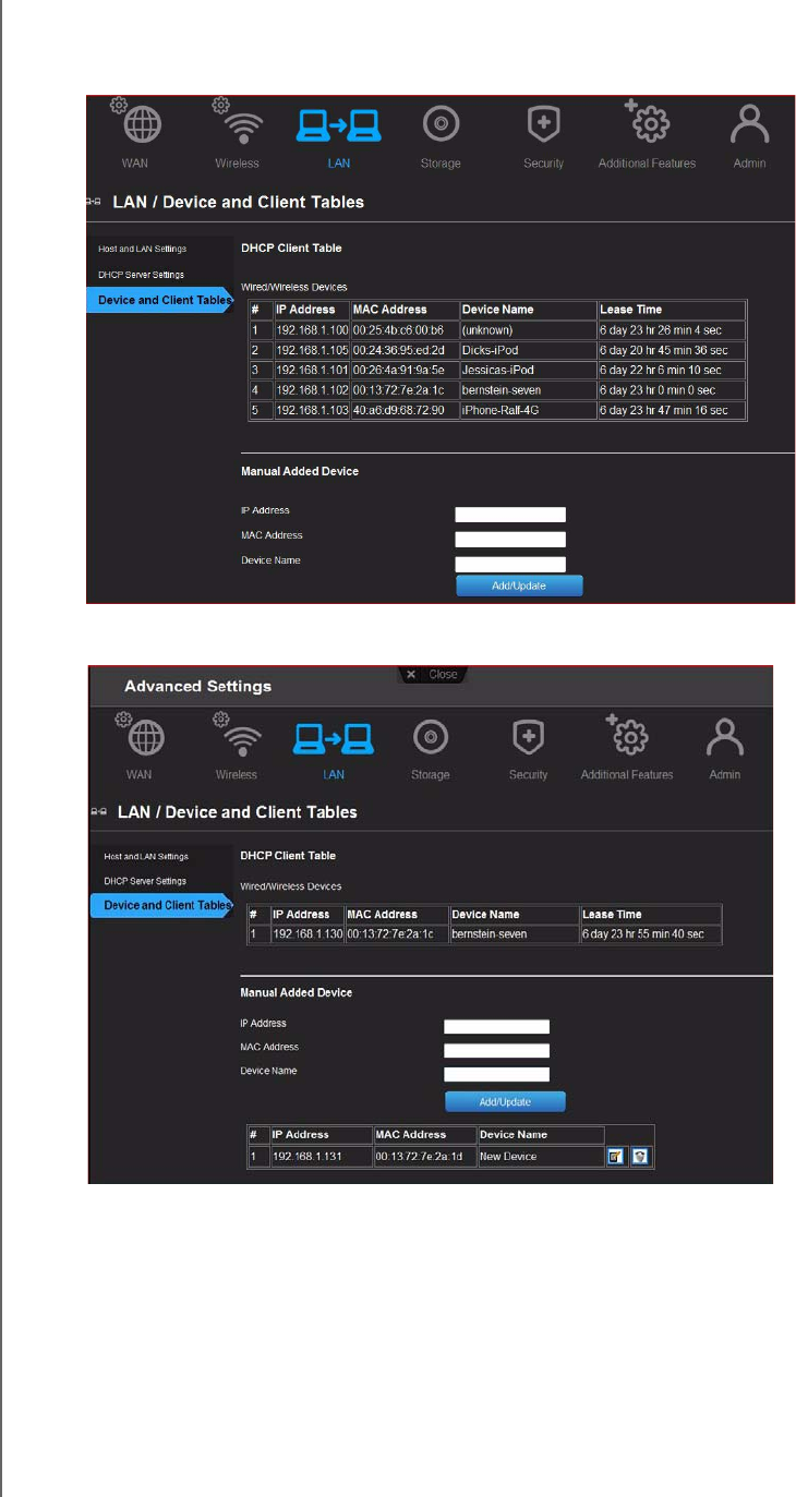 8. Click the Device and Client Table tab. The table lists all of the client devices (wired/