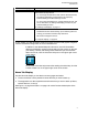 WD SMARTWARE SOFTWARE USER MANUAL Table 5. Help Tab Functional Description Display Component Description Contact Us link Uses your Web browser to connect to the WD Service & Support Contact Us page at http://support.wd.com/contact. Learning Center topic buttons Provide links to display the main Learning Center help topics: Overview Backup Retrieve Manage & Customize Online User Manuals link Uses your Web browser to connect to the user manual page for the WD SmartWare software at: http://www.wd.