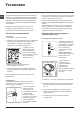 Описание стиральной машины и порядка запуска программы CIS Панель управления Индикаторы ВЫПОЛНЕНИЯ ФАЗ ЦИКЛА Кнопки с индикаторами дополнительных Индикаторы ФУНКЦИЙ Кнопка ВКЛ/ВЫКЛ Рукоятка выбора ПРОГРАММ Распределитель моющих средств Кнопка ТЕМПЕРАТУРЫ Кнопка ОТЖИМА Распределитель моющих средств: для загрузки стиральных веществ и добавок (см. «Моющие средства и типы белья»). Кнопка ВКЛ/ВЫКЛ: служит для включения и выключения стиральной машины.