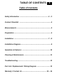 TABLE OF CONTENTS 1 Table of Contents Safety Information .............................................................. 2 – 3 Content Checklist ..................................................................... 4 Measurements ........................................................................... 5 Preparation ................................................................................ 6 Installation ...........................................................................