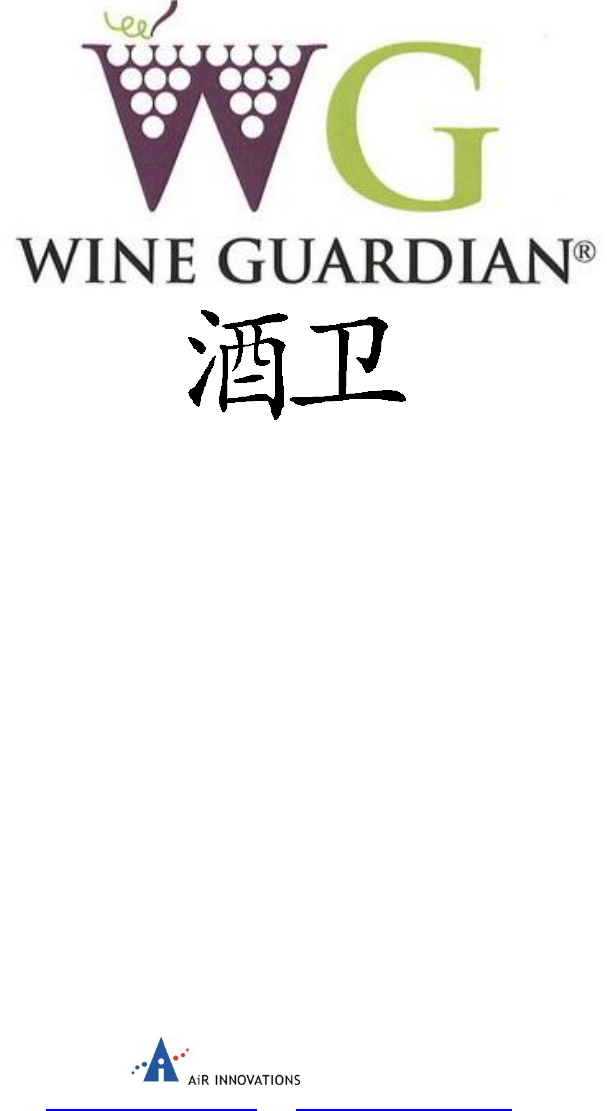 Contact and Warranty Information 保修联络信息 Contact Information 联络信息 Wine Guardian 7000 Performance Drive North Syracuse, NY 13212 Service Department: press 3 Direct: (315) 452-7420 Service Department: ext. 7434 制造商 美国空气创新公司制造商 美国空气创新公司总部地址如下 Normal business hours are 8 a.m. to 5 p.m. Eastern,USA Monday-Friday. After hours, contact: (315) 391-8747 Web site: www.airinnovations.com Email: info@airinnovations.