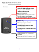 Part 1 Product introduction Overview GPS LED: (Green LED) Green LED Solid light shows location fixing incomplete .Blink light shows location fixing completed. Power LED: (Red LED) Red light blinks if battery power is low. Red light solid on while charging. After fully charged red light will snuff out. Bluetooth LED: Light turns off when Blue tooth connection is off. Blue light solid on when Blue tooth connection initiates. Blue light blinks if Blue tooth connection succeeds.